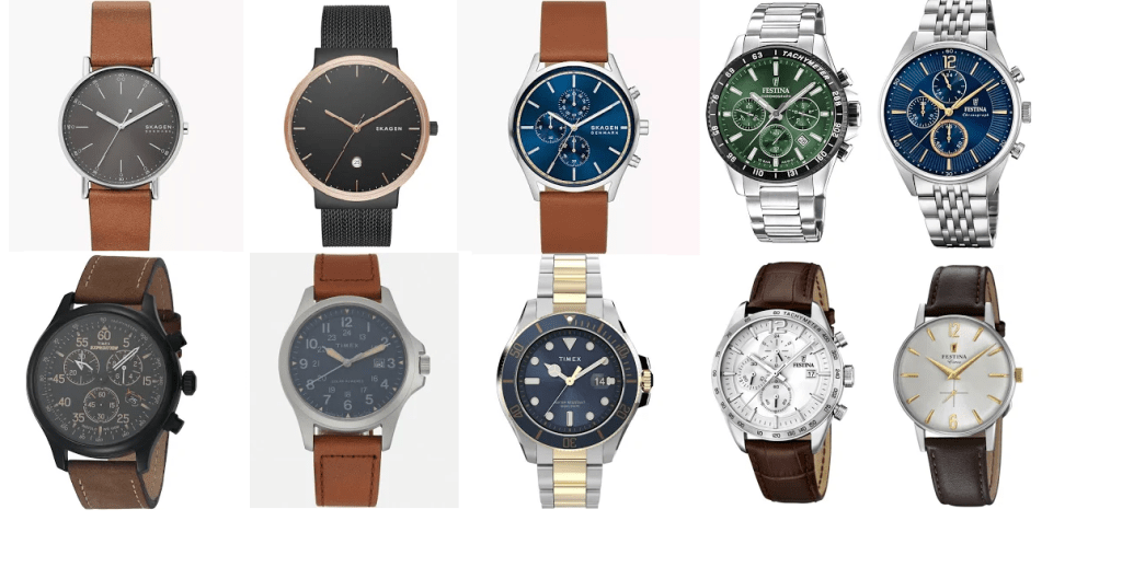 For watches, you might want to look at classic chronographs or dress-watches. Timex, Festina or Skagen offer beautiful minimalistic styles that can upgrade each and every outfit and won’t be hard to match with the underlying color scheme of your wardrobe items. If you want to add even more variety to your watch, instead of buying a bunch of them, get additional nato-straps to play around with colors/ material.