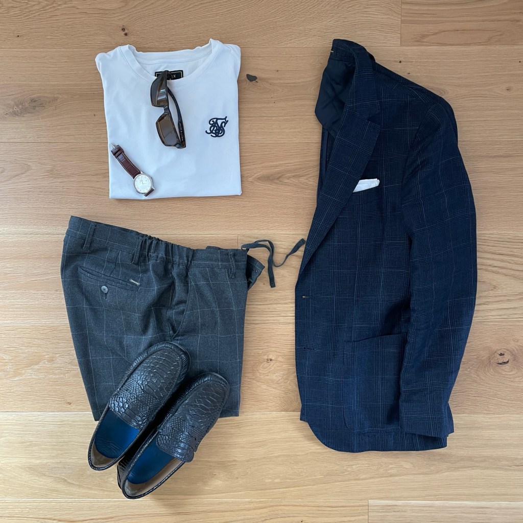 Blue Linen Blazer, with a white shirt below, some grey wool chinos and slippers. Pocketsquare is a must, (no-show) socks are optional.