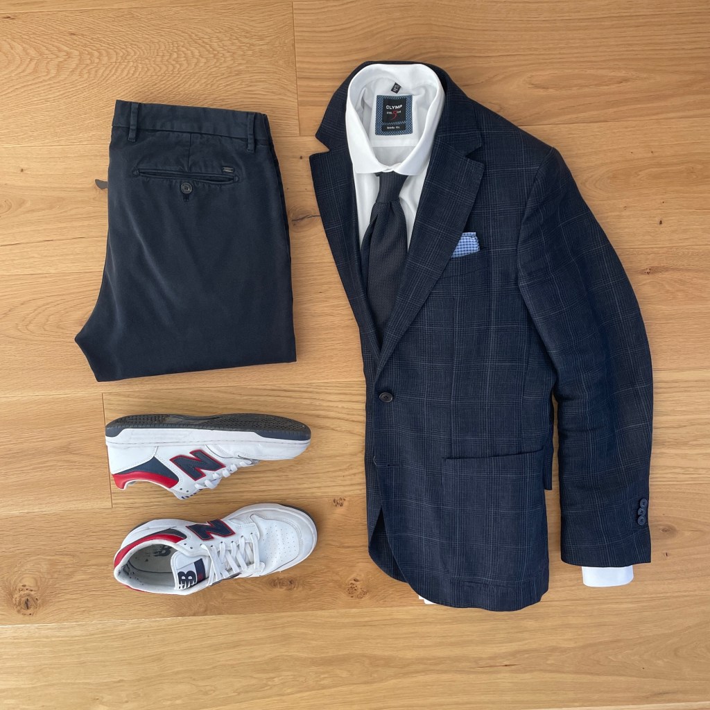Navy tie, chino and Blazer, white shirt and sneakers.