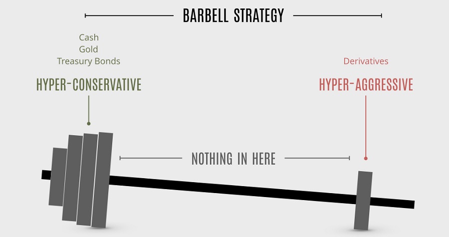 A risk management strategy that involves taking a combination of extreme safe bets (highly conservative) and extreme aggressive bets (highly speculative), avoiding the middle. This strategy balances risk and reward, reducing exposure to the negative effects of unexpected events while benefiting from potential gains.