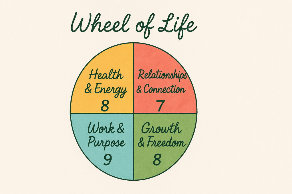 The Wheel of Life is a personal development tool designed to visualize how balanced your life feels. Traditionally, you divide a circle into several segments (health, work, relationships, finances, hobbies, etc.) and rate each from 1–10. The resulting “wheel” shows where you’re rolling smoothly — or hitting bumps that throw you off course.